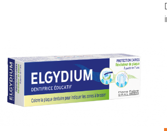 Elgydium Gel Dentrífico Educativo Revelador Placa contém fluorinol para ajudar a proteger os dentes contra as cáries, assim como uma associação de corantes especificamente selecionados pela sua capacidade de dar coloração à placa bacteriana.