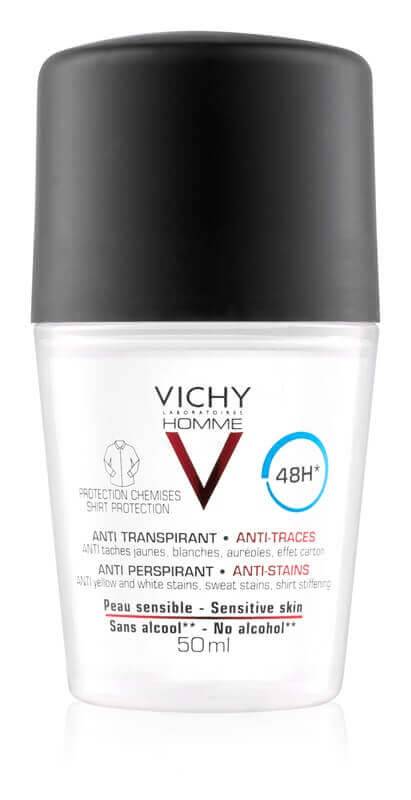 Vichy Homme Deo Roll-On Antimanchas 48H é indicado para homens que procuram um desodorizante ultrafresco de longa duração.